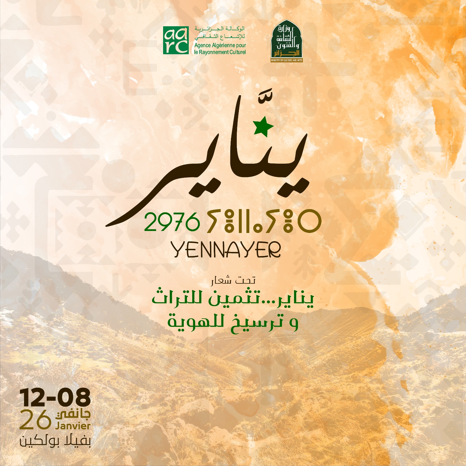 في إطار جهودها المتواصلة لصون الموروث الثقافي الوطني وتثمينه، تنظم الوكالة الجزائرية للإشعاع الثقافي، بمناسبة الاحتفال برأس السنة الأمازيغية يناير، معرضًا–بيعًا للحرف والصناعات التقليدية، وذلك خلال الفترة الممتدة من 08 إلى 12 جانفي 2026، بـ فيلا بولكين.